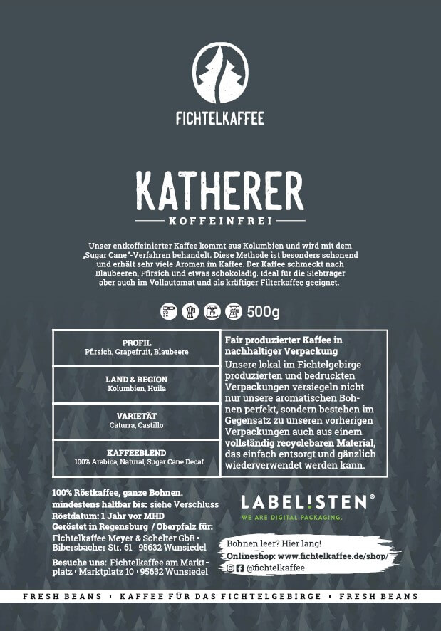 Unser entkoffeinierter Kaffee kommt aus Kolumbien und wird mit dem „Sugar Cane“ – Verfahren behandelt. Diese Methode ist besonders schonend und erhält sehr viele Aromen im Kaffee. Der Kaffee schmeckt nach Blaubeeren, Pfirsich und etwas schokoladig. Ideal für Siebträger aber auch im Vollautomat und als kräftiger Filterkaffee geeignet. Katherer Koffeinfrei hat seinen Namen vom Wunsiedler Katharinenberg (618m). Im Gipfelbereich steht die Ruine der ehemaligen Wallfahrtskirche, das älteste Bauwerk Wunsiedels, das der heiligen Katharina von Alexandrien geweiht war. Erstmals urkundlich erwähnt wurde die Ruine im Jahr 1364.